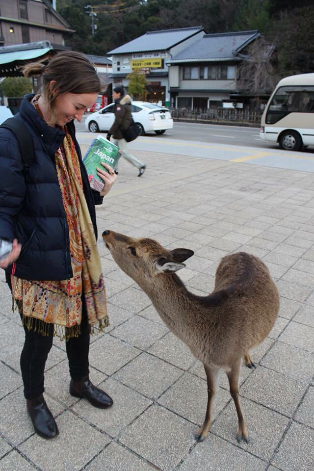 With the sun quickly descending we decided to make a quick dash out to Miyajima – a small island off Hiroshisma, home of the vermillion torii (shrine gate) of Itsukushima-jinja. Racing the sun and clock, we stopped to ask some local deer for directions before reaching the torii for sunset. The deer were everywhere and watching them stick their heads into prams and wheelchairs reminded me of the monkeys in Bali. We found one very resourceful deer, however, who had decided eating his own poop was the most economical approach. Anyway! After gawking at all the girls walking around in heels and mini skirts, we trudged our way out to the torii. The tide was out so it didn’t appear to be floating like often photographed but it meant we were able to go and touch it! Even cooler!