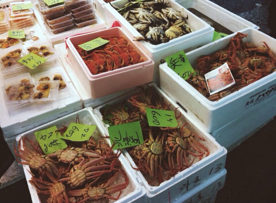 Another early morning, though not as early as the tuna auctioneers that start at 4.30am, we rose and left for the Tsukiji Fish Markets. Getting off the train it was easy to work out where the markets were – just stepping onto the busy sidewalk was like being picked up by a current and swept away like, well…like a school of fish I guess. How appropriate. Deciding to leave the outer market for later, we hit the serious part, and while a lot was already sold out, we managed to see heaps. Huge tunas being sliced and diced by huge knives or bandsaws, crabs that were still crawling, the biggest prawns I’ve ever seen, sea cucumbers, something I’m not sure what, clams for miles, fish in all shapes, sizes and colours, octopus, squid, and most importantly, some of the freshest, most delicious looking sashimi ever.