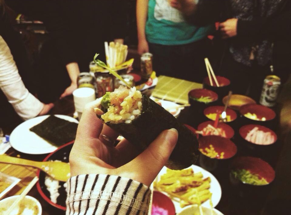 Hand roll sushi party. Is there a sushi rolling machine? In Tokyo probably somewhere. Keep em coming Emma.