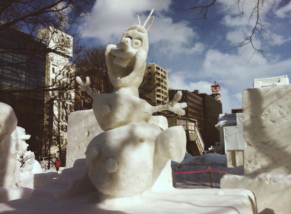 After doing the whole circuit of Odori Park, while having to run across the road and stand in a heated convenience store every five-seven minutes so that Hannah could defrost, we managed to see all the sculptures. I much preferred them during the day with the blue sky as a backdrop. But do not be fooled, the temperature was well into the negatives at this point. As an added bonus, we managed to spot some pretty interesting people as well as ice sculptures, including a pram with skies on its wheels and a mother dragging her kids around in a taboggine. Clearly the most efficient way of travel in the snow. Those kids have it sorted. The best thing we could do to keep going was to constantly drink coffee, and I tried something called an almond chocolate latte? When in Rome…?
