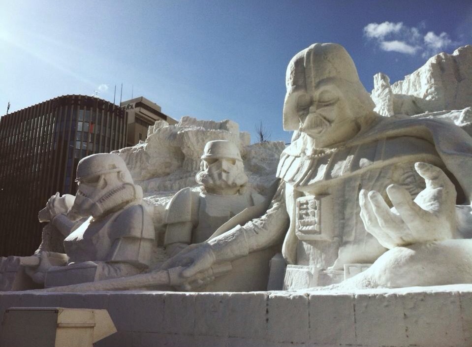 The Sapporo Snow Festival was very close to our hotel, an easy walk apart from all the slippery ice on the footpath. Nonetheless we persevered and were rewarded with the stunning massive ice sculptures that were lit up with brightly coloured lights and music. Although a subzero temperature, the crowds flocked to see the incredible statues and huddled around the food stores that scattered the park (easy to spot from the steam bellowing out of their tents). My favourite of all the sculptures was the Star Wars installation, whereas Hannah’s architectural eye drew her more towards the castles.