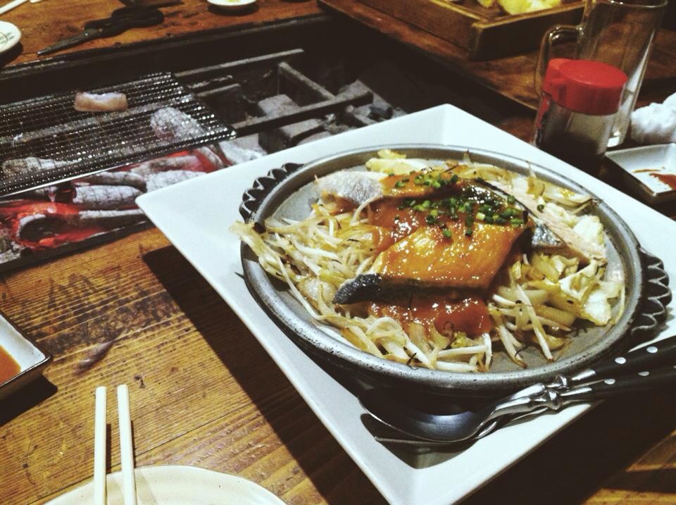 Not lasting for long in the freezing cold we headed off to find some food. Being warned off the highly alluring Ramen Street by some of our new friends we made this trip, we instead opted for a little doorway that had heaps of locals lining up outside and a tripadvisor sticker in the window – two very good signs. And I think we hit the jackpot on this one. Once it was our turn, we were given a booth that we shared with three other couples, all sitting across a huge open fire pit. Unsure of whether it was designed for cooking or heating, we attempted to defrost our hands while perusing the menu, much to the entertainment of the couple sitting across from us. We ended up ordering a huge grilled salmon and miso salad and a few chicken skewers to share, and spent most of the night staring obviously at the couple across from us as they cooked their seafood banquet on the open grill. So much so that after a while the man offered us a piece of his grilled squid. Oops!
